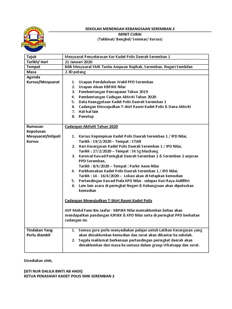 Minit Curai Mesyuarat Kadet Polis Daerah Seremban 1 Pdf