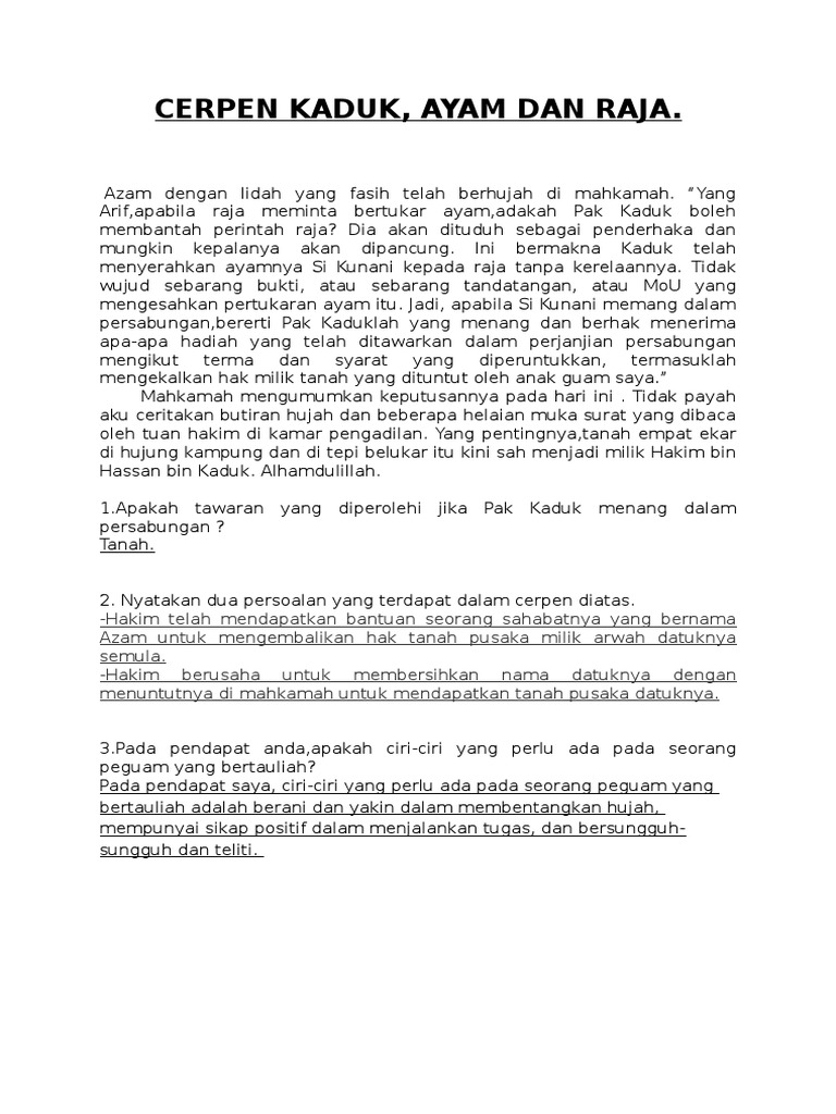 Bahasa Melayu Bahasa Malaysia Pmr Spm Cerpen Komsas Tingkatan 4 Kaduk Ayam Dan Raja