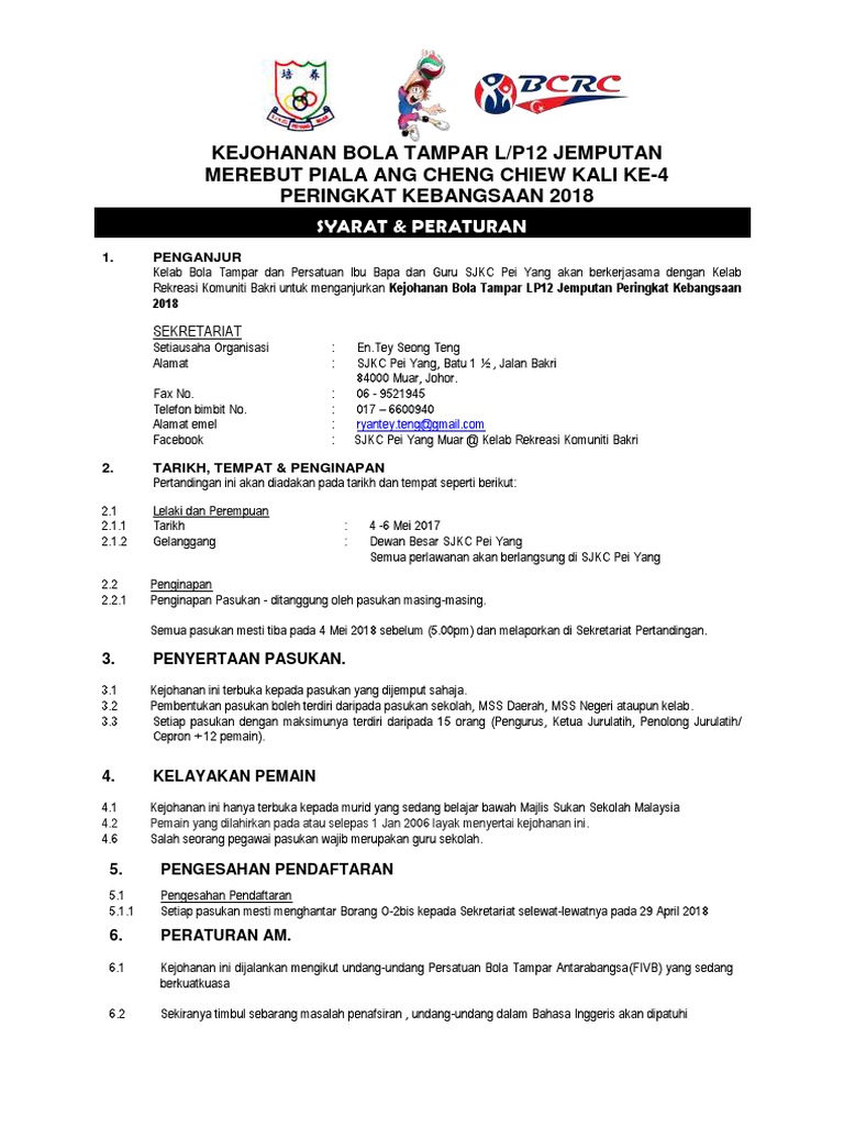 Syarat Peraturan Kejohanan Bola Tampar B12 2018