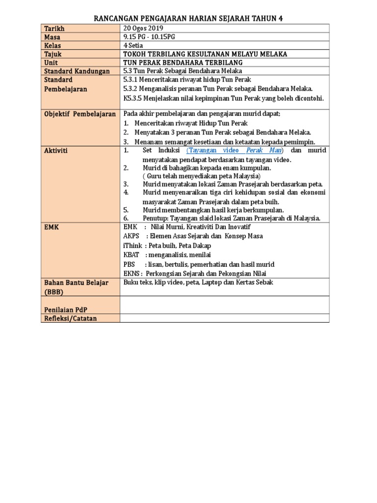 Doc Rancangan Pengajaran Harian Sejarah Tahun 4 Mem Mm Academia Edu