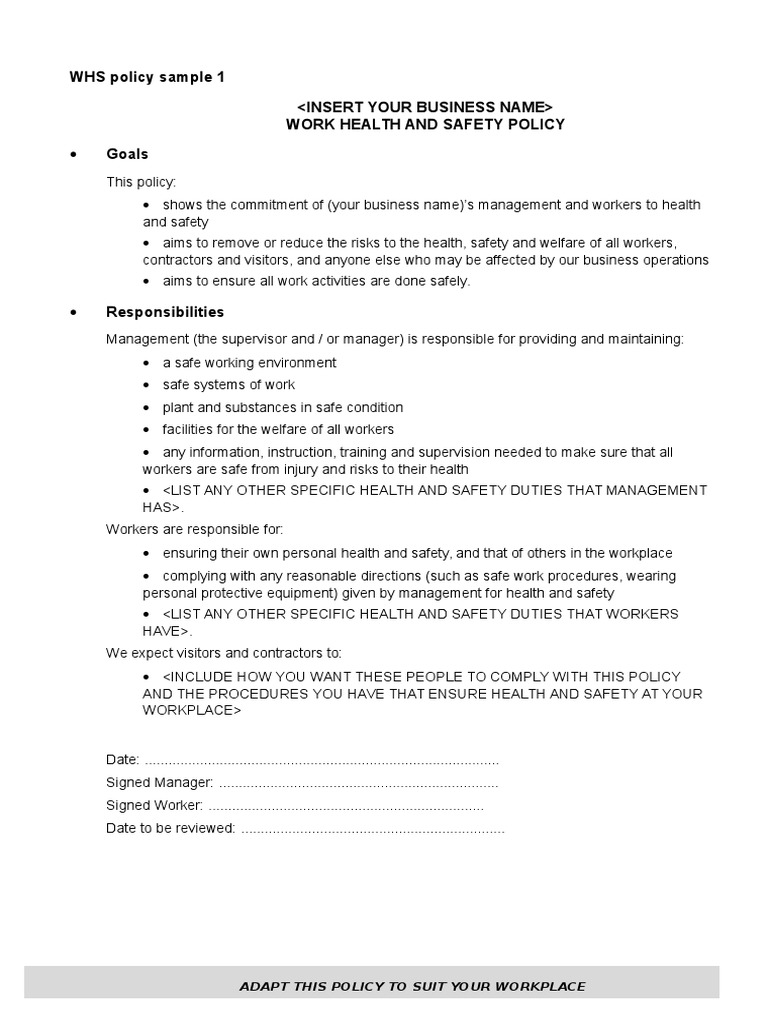Work Health And Safety Policy Example Occupational Safety And Health Safety