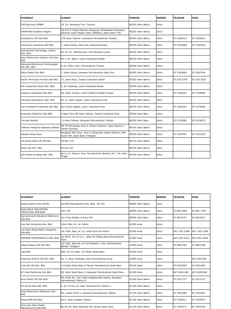 Doc Senarai Nama Kilang Di Kawasan Perindustrian Tangkak Azahari Dasuki Academia Edu
