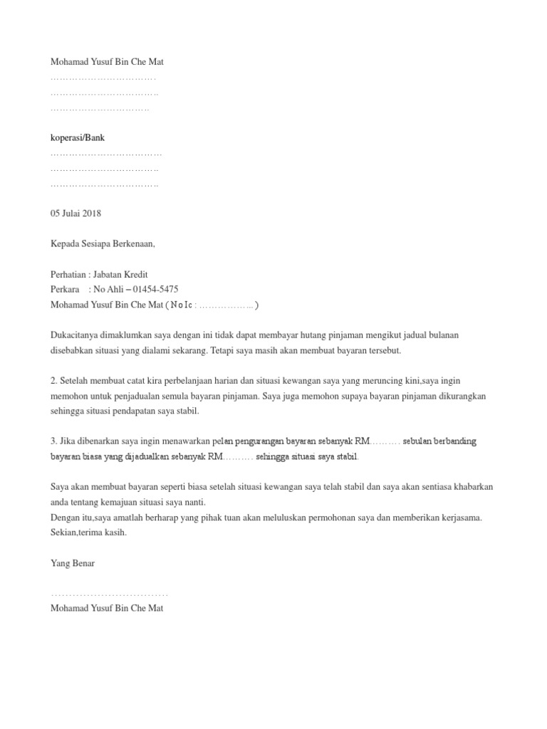 Contoh Surat Rayuan Bayaran Semula Pinjaman Kepada Koperasi Atau Bank